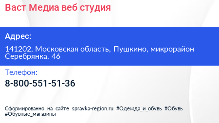 Васт Медиа, веб-студия по адресу 141202, Московская область, Пушкино, микрорайон Серебрянка, 46 в дальнейшем Организация, размещена в следующих категориях: