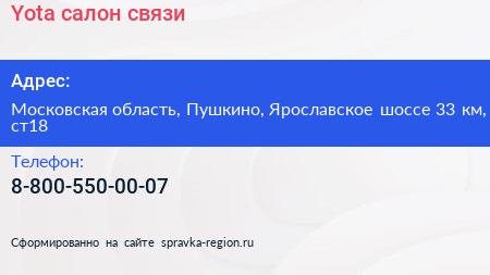 Yota, салон связи по адресу Московская область, Пушкино, Ярославское шоссе 33 км, ст18 в дальнейшем Организация, размещена в следующих категориях: