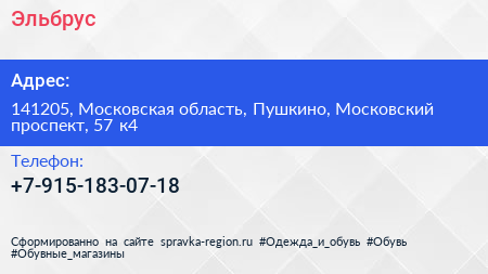 Эльбрус по адресу 141205, Московская область, Пушкино, Московский проспект, 57 к4 в дальнейшем Организация, размещена в следующих категориях: