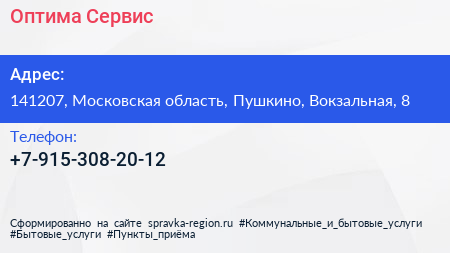 Оптима-Сервис по адресу 141207, Московская область, Пушкино, Вокзальная, 8 в дальнейшем Организация, размещена в следующих категориях: