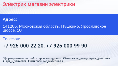 Электрик, магазин электрики по адресу 141205, Московская область, Пушкино, Ярославское шоссе, 10 в дальнейшем Организация, размещена в следующих категориях: