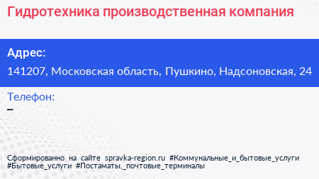 Гидротехника, производственная компания по адресу 141207, Московская область, Пушкино, Надсоновская, 24 в дальнейшем Организация, размещена в следующих категориях: