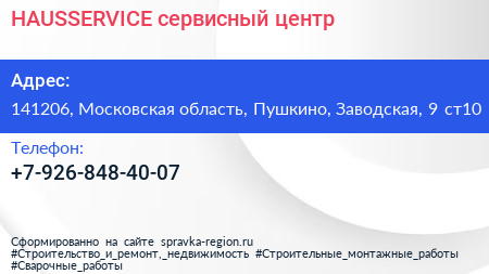 HAUSSERVICE, сервисный центр по адресу 141206, Московская область, Пушкино, Заводская, 9 ст10 в дальнейшем Организация, размещена в следующих категориях: