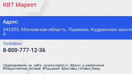 КВТ Маркет по адресу 141205, Московская область, Пушкино, Кудринское шоссе, 6 в дальнейшем Организация, размещена в следующих категориях: