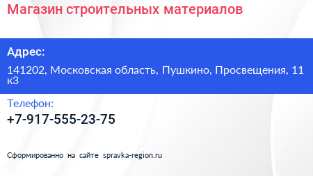Магазин строительных материалов по адресу 141202, Московская область, Пушкино, Просвещения, 11 к3 в дальнейшем Организация, размещена в следующих категориях: