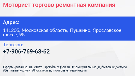 Моторист, торгово-ремонтная компания по адресу 141205, Московская область, Пушкино, Ярославское шоссе, 98 в дальнейшем Организация, размещена в следующих категориях: