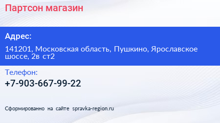 Партсон, магазин по адресу 141201, Московская область, Пушкино, Ярославское шоссе, 2в ст2 в дальнейшем Организация, размещена в следующих категориях: