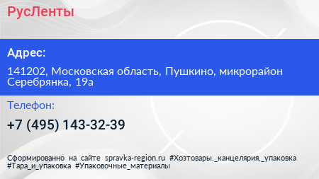 РусЛенты по адресу 141202, Московская область, Пушкино, микрорайон Серебрянка, 19а в дальнейшем Организация, размещена в следующих категориях: