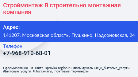 Строймонтаж В, строительно-монтажная компания по адресу 141207, Московская область, Пушкино, Надсоновская, 24 в дальнейшем Организация, размещена в следующих категориях: