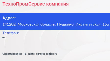 ТехноПромСервис, компания по адресу 141202, Московская область, Пушкино, Институтская, 15а в дальнейшем Организация, размещена в следующих категориях: