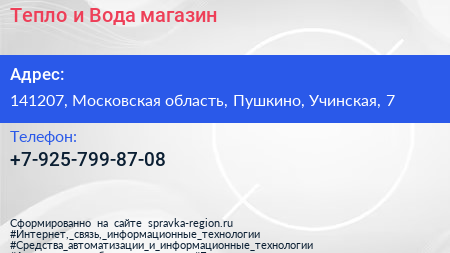 Тепло и Вода, магазин по адресу 141207, Московская область, Пушкино, Учинская, 7 в дальнейшем Организация, размещена в следующих категориях: