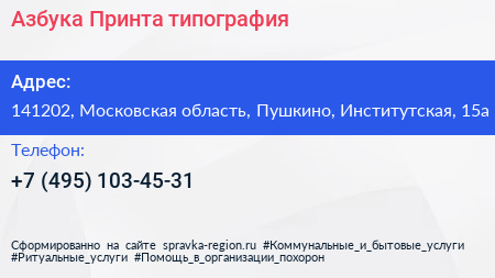 Азбука Принта, типография по адресу 141202, Московская область, Пушкино, Институтская, 15а в дальнейшем Организация, размещена в следующих категориях: