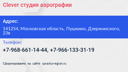 Clever, студия аэрографии по адресу 141254, Московская область, Пушкино, Дзержинского, 23в в дальнейшем Организация, размещена в следующих категориях: