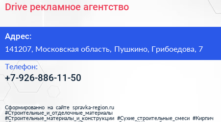 Drive, рекламное агентство по адресу 141207, Московская область, Пушкино, Грибоедова, 7 в дальнейшем Организация, размещена в следующих категориях: