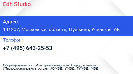 Edh Studio по адресу 141207, Московская область, Пушкино, Учинская, 6Б в дальнейшем Организация, размещена в следующих категориях: