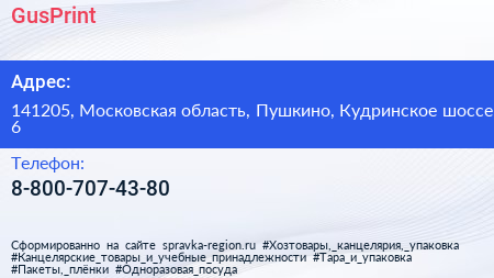 GusPrint по адресу 141205, Московская область, Пушкино, Кудринское шоссе, 6 в дальнейшем Организация, размещена в следующих категориях: