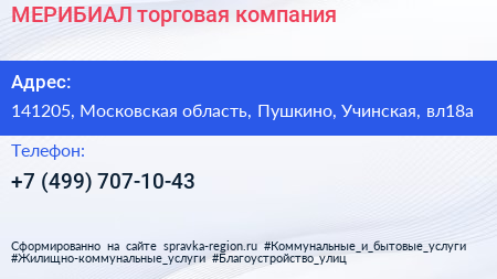 МЕРИБИАЛ, торговая компания по адресу 141205, Московская область, Пушкино, Учинская, вл18а в дальнейшем Организация, размещена в следующих категориях: