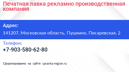Печатная лавка, рекламно-производственная компания по адресу 141207, Московская область, Пушкино, Писаревская, 2 в дальнейшем Организация, размещена в следующих категориях: