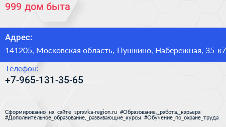 999, дом быта по адресу 141205, Московская область, Пушкино, Набережная, 35 к7 в дальнейшем Организация, размещена в следующих категориях: