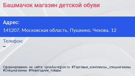 Башмачок, магазин детской обуви по адресу 141207, Московская область, Пушкино, Чехова, 12 в дальнейшем Организация, размещена в следующих категориях: