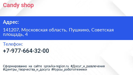 Candy shop по адресу 141207, Московская область, Пушкино, Советская площадь, 4 в дальнейшем Организация, размещена в следующих категориях: