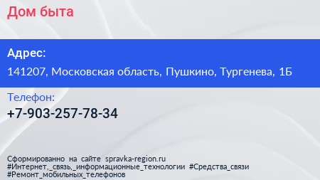 Дом быта по адресу 141207, Московская область, Пушкино, Тургенева, 1Б в дальнейшем Организация, размещена в следующих категориях: