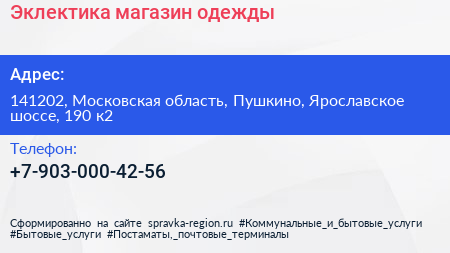 Эклектика, магазин одежды по адресу 141202, Московская область, Пушкино, Ярославское шоссе, 190 к2 в дальнейшем Организация, размещена в следующих категориях: