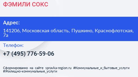 ФЭМИЛИ СОКС по адресу 141206, Московская область, Пушкино, Краснофлотская, 7а в дальнейшем Организация, размещена в следующих категориях: