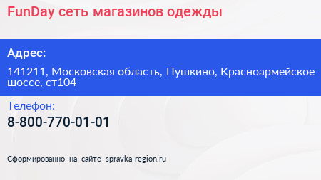 FunDay, сеть магазинов одежды по адресу 141211, Московская область, Пушкино, Красноармейское шоссе, ст104 в дальнейшем Организация, размещена в следующих категориях: