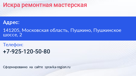 Искра, ремонтная мастерская по адресу 141205, Московская область, Пушкино, Пушкинское шоссе, 2 в дальнейшем Организация, размещена в следующих категориях: