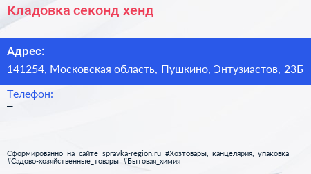 Кладовка, секонд-хенд по адресу 141254, Московская область, Пушкино, Энтузиастов, 23Б в дальнейшем Организация, размещена в следующих категориях: