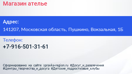 Магазин-ателье по адресу 141207, Московская область, Пушкино, Вокзальная, 1Б в дальнейшем Организация, размещена в следующих категориях: