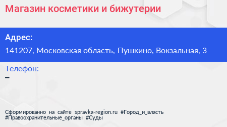 Магазин косметики и бижутерии по адресу 141207, Московская область, Пушкино, Вокзальная, 3 в дальнейшем Организация, размещена в следующих категориях: