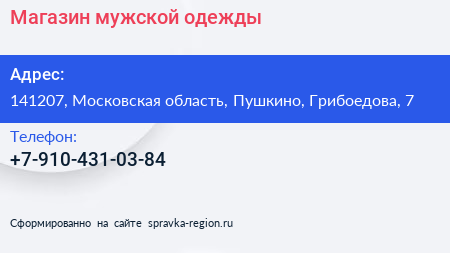Магазин мужской одежды по адресу 141207, Московская область, Пушкино, Грибоедова, 7 в дальнейшем Организация, размещена в следующих категориях: