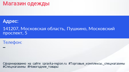 Магазин одежды по адресу 141207, Московская область, Пушкино, Московский проспект, 5 в дальнейшем Организация, размещена в следующих категориях: