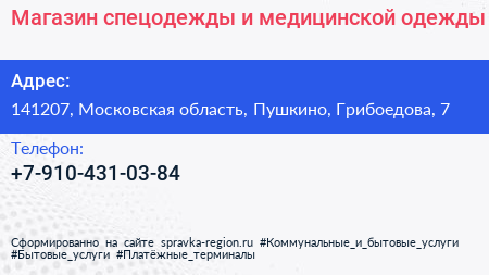 Магазин спецодежды и медицинской одежды по адресу 141207, Московская область, Пушкино, Грибоедова, 7 в дальнейшем Организация, размещена в следующих категориях: