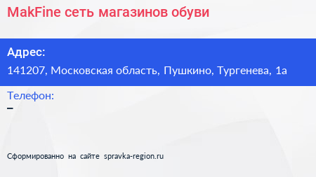MakFine, сеть магазинов обуви по адресу 141207, Московская область, Пушкино, Тургенева, 1а в дальнейшем Организация, размещена в следующих категориях: