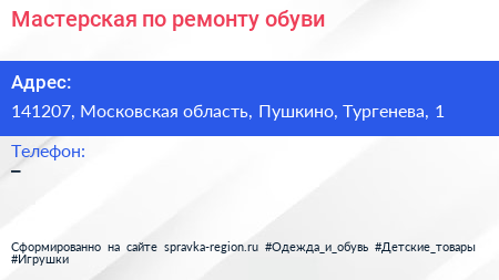 Мастерская по ремонту обуви по адресу 141207, Московская область, Пушкино, Тургенева, 1 в дальнейшем Организация, размещена в следующих категориях: