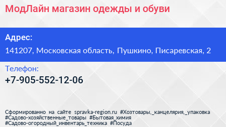 МодЛайн, магазин одежды и обуви по адресу 141207, Московская область, Пушкино, Писаревская, 2 в дальнейшем Организация, размещена в следующих категориях: