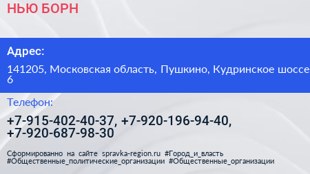 НЬЮ-БОРН по адресу 141205, Московская область, Пушкино, Кудринское шоссе, 6 в дальнейшем Организация, размещена в следующих категориях: