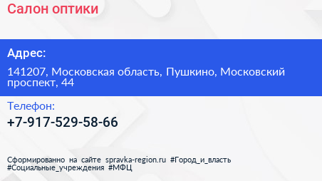 Салон оптики по адресу 141207, Московская область, Пушкино, Московский проспект, 44 в дальнейшем Организация, размещена в следующих категориях: