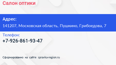 Салон оптики по адресу 141207, Московская область, Пушкино, Грибоедова, 7 в дальнейшем Организация, размещена в следующих категориях: