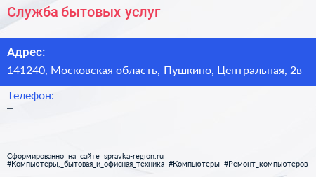 Служба бытовых услуг по адресу 141240, Московская область, Пушкино, Центральная, 2в в дальнейшем Организация, размещена в следующих категориях: