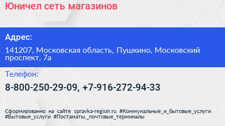 Юничел, сеть магазинов по адресу 141207, Московская область, Пушкино, Московский проспект, 7а в дальнейшем Организация, размещена в следующих категориях: