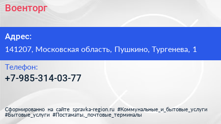Военторг по адресу 141207, Московская область, Пушкино, Тургенева, 1 в дальнейшем Организация, размещена в следующих категориях: