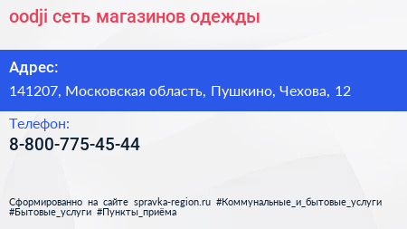 oodji, сеть магазинов одежды по адресу 141207, Московская область, Пушкино, Чехова, 12 в дальнейшем Организация, размещена в следующих категориях: