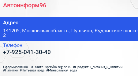 Автоинформ96 по адресу 141205, Московская область, Пушкино, Кудринское шоссе, 2 в дальнейшем Организация, размещена в следующих категориях: