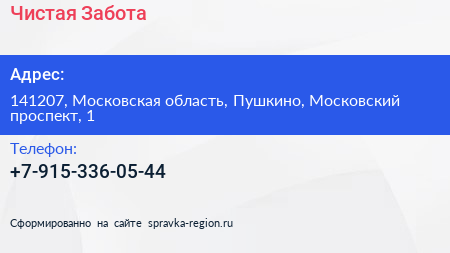 Чистая Забота по адресу 141207, Московская область, Пушкино, Московский проспект, 1 в дальнейшем Организация, размещена в следующих категориях: