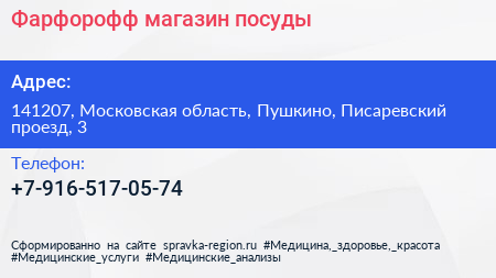 Фарфорофф, магазин посуды по адресу 141207, Московская область, Пушкино, Писаревский проезд, 3 в дальнейшем Организация, размещена в следующих категориях: