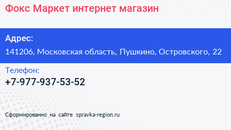 Фокс-Маркет, интернет-магазин по адресу 141206, Московская область, Пушкино, Островского, 22 в дальнейшем Организация, размещена в следующих категориях: